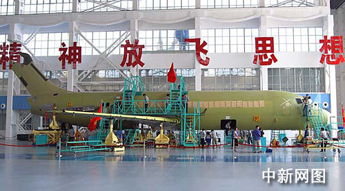 中國首架自主知識(shí)產(chǎn)權(quán)的噴氣支線客機(jī)ARJ21正在總裝中。