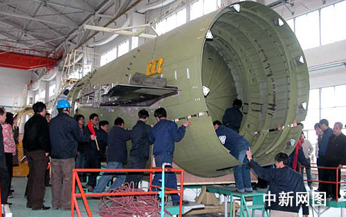 中國首架自主知識產(chǎn)權(quán)的噴氣支線客機(jī)ARJ21總裝前中后機(jī)身上下對合。