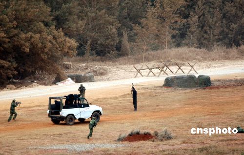 12月25日 “攜手-2007”中印陸軍聯(lián)合反恐訓(xùn)練圓滿結(jié)束。隨著實(shí)兵綜合演練課目的完成,中印兩軍舉行了簡(jiǎn)短而熱烈的訓(xùn)練結(jié)束儀式。中新社發(fā) 張雷 攝