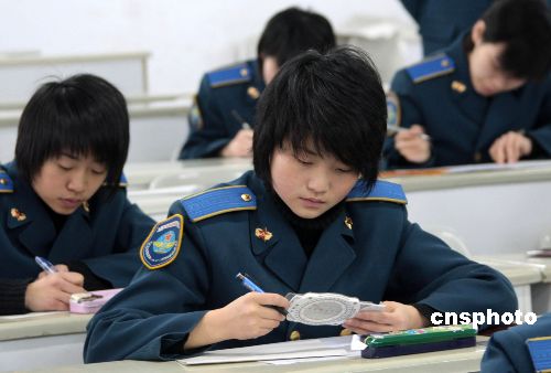 圖為女飛行學員聚精會神地接受航空理論知識考核。