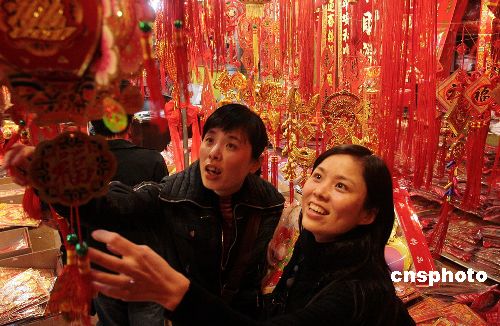 十二月三十一日,為了迎接新年,福建泉州購買喜慶用品的市民絡(luò)繹不絕,市場熱鬧非凡!氨瘛睊旒、彩燈、“中國結(jié)”等的銷售異;鸨,家家戶戶都將自家里里外外裝點一新迎接新年。中新社發(fā) 傅丹丹 攝