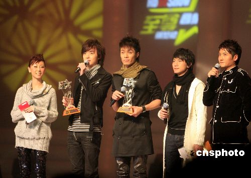 人氣歌手泳兒(左1)為洪卓立(左2)、周柏豪(左3)、陳柏宇頒發(fā)至尊男新人獎。