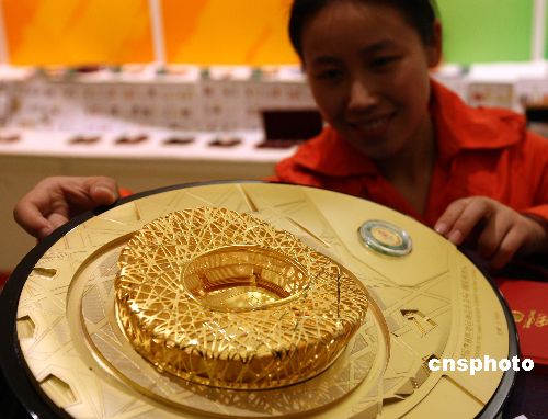 一月五日,北京奧組委推出七十余款?yuàn)W運(yùn)貴金屬特許商品新品,其中包括常規(guī)鍍金銀類產(chǎn)品、金銀類產(chǎn)品及珍藏系列金銀、金玉新工藝紀(jì)念章等。這些產(chǎn)品將奧運(yùn)元素與中國文化和諧融合一體,彰顯“綠色奧運(yùn)、科技奧運(yùn)、人文奧運(yùn)”的理念。中新社發(fā) 任海霞 攝