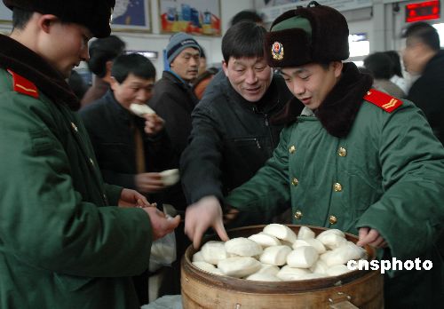1月31日中午,武警浙江省臺(tái)州市消防支隊(duì)?wèi)?zhàn)士孫嘉飛和曹敏抬著200余只熱饅頭,來到臺(tái)州市客運(yùn)總站,送給因雨雪天氣滯留在車站的旅客。連日來,消防戰(zhàn)士們送免費(fèi)餐的忙碌身影活躍在臺(tái)州各縣市車站。中新社發(fā) 朱叢義 攝
