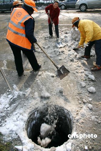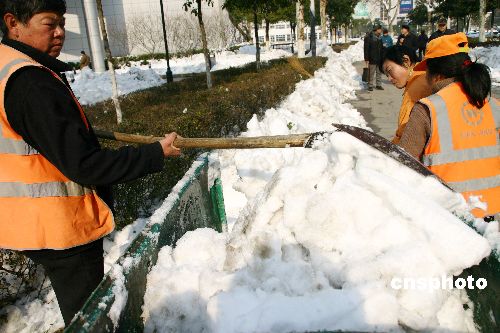 2008年1月31日,環(huán)衛(wèi)工人在南京山西路廣場(chǎng)清理積雪。南京連續(xù)兩天放睛,街頭到處可見掃雪人,環(huán)衛(wèi)工人運(yùn)用各種辦法掃除公路兩邊、市民廣場(chǎng)和景區(qū)內(nèi)的積雪。受連續(xù)暴雪影響,南京城內(nèi)到處是堆積如山的白雪。中新社發(fā) 阿董 攝