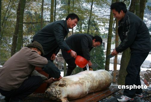 2月4日是農(nóng)歷的“立春”節(jié)氣,被冰雪封凍20多天的廣西融水縣滾貝鄉(xiāng)災(zāi)民殺豬喜迎新春。由于得到當(dāng)?shù)卣募皶r救助,面對遭受57年來最嚴(yán)重的雨雪冰凍災(zāi)害,災(zāi)民們對未來依然充滿信心。中新社發(fā) 張耀華 攝