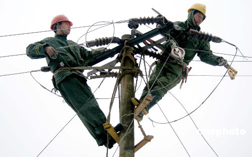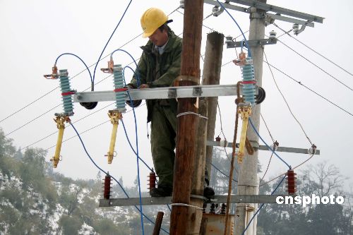 2月5日,婺源縣供電公司工作人員在贛浙皖邊界的江灣鎮(zhèn)大瀲村搶修。雪災(zāi)造成江西省婺源縣山區(qū)大部分供電系統(tǒng)中斷,大山里的村民無法正常用電。國家電網(wǎng)公司江西省電力公司婺源縣供電公司立即組織“黨團員突擊搶修隊”和“電力110”搶修小分隊奔赴山區(qū)搶修線路。中新社發(fā) 王國紅 攝