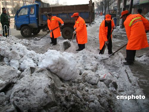 2008年2月7日,大年初一,安徽蒙城縣環(huán)衛(wèi)工人放棄休息,對(duì)市區(qū)主要道路人行道上的積雪進(jìn)行清理,以辛苦勞動(dòng)為歡度春節(jié)的市民營(yíng)造良好的出行環(huán)境。中新社發(fā) 胡衛(wèi)國(guó) 攝