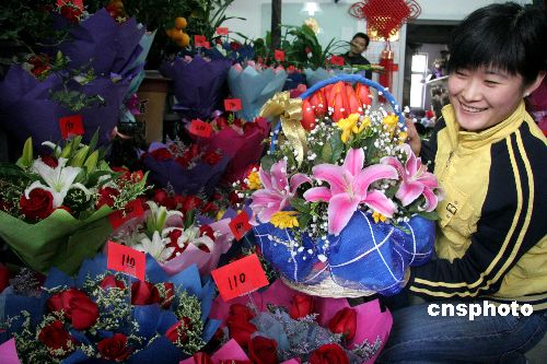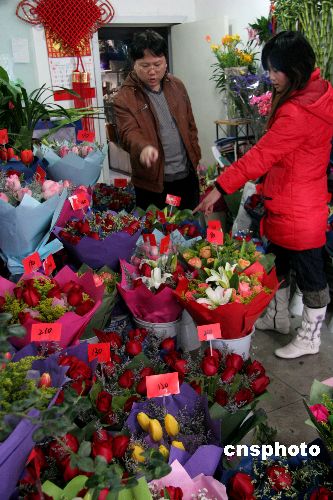2月13日,顧客在挑選鮮花。為迎接“情人節(jié)”,山東威海各花店生意紅火,許多顧客為女友和母親訂購鮮花,鮮花市場銷售異;鸨S多花店為此招臨時工幫忙。中新社發(fā) 海云飛 攝
