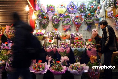 二月十三日,一位市民走過香港街頭的鮮花攤檔。情人節(jié)前夕,香港各鮮花店生意開始昌旺。中新社發(fā) 武仲林 攝