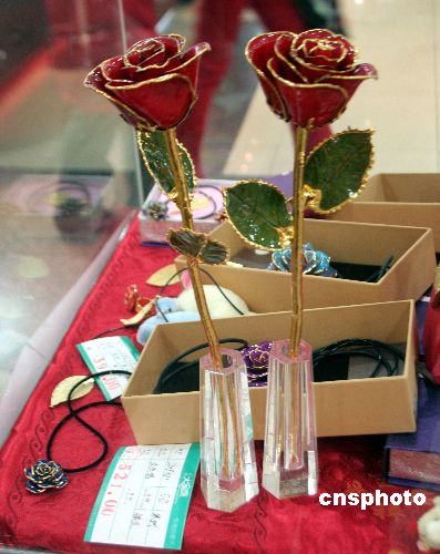 2008年2月13日,“情人節(jié)”前夕,遼寧省沈陽市中街一商廈售價521元的金玫瑰花面市。中新社發(fā) 劉寶成 攝