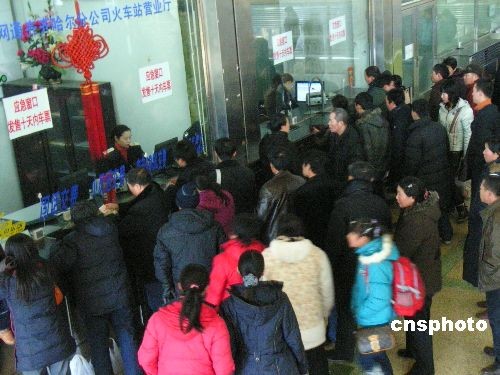 2月15日,人們在齊齊哈爾火車站售票大廳購票。當(dāng)日,齊齊哈爾火車站在探親返城客流和農(nóng)民工客流出現(xiàn)高峰后,又迎來學(xué)生客流高峰,日送來往旅客達(dá)2.5萬人。為緩解購票難,車站增加了應(yīng)急售票窗口,車站派出所派出警力24小時巡查,并在廣場設(shè)置一臺報警服務(wù)車,隨時為旅客提供服務(wù)。 中新社發(fā) 王云龍 攝