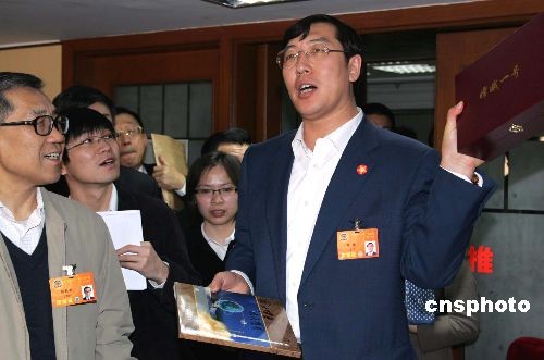 三月四日,在全國(guó)政協(xié)小組討論會(huì)上,政協(xié)委員、億陽(yáng)集團(tuán)董事長(zhǎng)鄧偉向委員們贈(zèng)送“嫦娥一號(hào)”模型。中新社發(fā) 潘索菲 攝