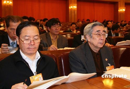 三月八日上午,全國(guó)政協(xié)十一屆一次會(huì)議第二次全體會(huì)議在北京人民大會(huì)堂舉行,民政部副部長(zhǎng)羅平飛和原廣播電影電視部法規(guī)司副司長(zhǎng)、魯迅之子周海嬰(右)參加會(huì)議。中新社發(fā) 盛佳鵬 攝