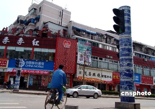 3月20日,“清明上河圖”瓷器紅綠燈亮相景德鎮(zhèn)市街頭。該燈為白底青花圖案,畫面內(nèi)容是清明上河圖,直徑0.5米,高4.2米。樹立在在景德鎮(zhèn)新廠的瓷器紅綠燈不但能指揮交通,美化城市,同時(shí)正逐漸成為景德鎮(zhèn)鮮明的瓷文化標(biāo)志符號(hào)之一。中新社發(fā) 石衛(wèi)明 攝