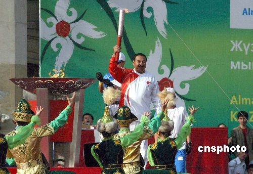 2000年奧運(yùn)會拳擊冠軍葉爾馬罕·伊布拉莫夫用手中的火炬點(diǎn)燃圣火盤后,展示手中的火炬。沈晨攝