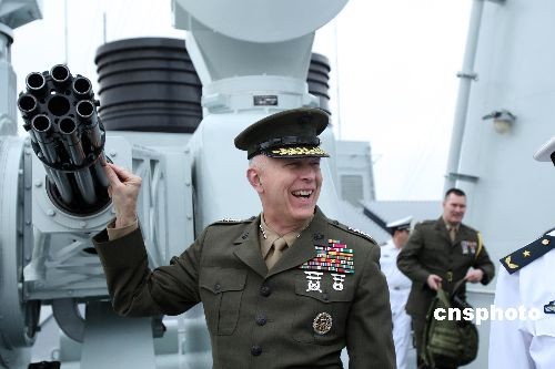 4月2日,美國(guó)海軍陸戰(zhàn)隊(duì)司令詹姆斯·康威上將一行開(kāi)始對(duì)中國(guó)南海艦隊(duì)進(jìn)行為期2天的參觀訪問(wèn)。南海艦隊(duì)副參謀長(zhǎng)么志樓少將下午陪同康威上將前往湛江軍港,登上中國(guó)海軍“武漢”號(hào)導(dǎo)彈驅(qū)逐艦和“羅霄山”號(hào)登陸艦參觀。康威興致勃勃地參觀了艦艇指揮作戰(zhàn)室、駕駛室和艦載武器等核心部位,聽(tīng)取了解說(shuō)員對(duì)艦艇有關(guān)性能的介紹?低䦟(duì)中國(guó)軍隊(duì)的開(kāi)放程度、透明程度和現(xiàn)代化程度表示稱(chēng)贊。圖為康威上將參觀“武漢”號(hào)導(dǎo)彈驅(qū)逐艦30炮,該軍艦是中國(guó)自行設(shè)計(jì)建造的新型現(xiàn)代化軍艦。中新社發(fā) 李唐 攝