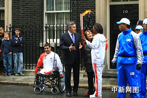 快訊:英國(guó)首相布朗在唐寧街歡迎北京奧運(yùn)圣火(圖)