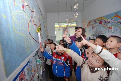 4月8日,山東濰坊市奎文區(qū)新華幼兒園師生正在自己親手制作的奧運圣火線路圖前,喊出對圣火的祝福。令世人矚目的奧運圣火傳遞,同樣也牽動著孩子們的心,山東濰坊市奎文區(qū)新華幼兒園的孩子們在老師的指導下制作了一面“奧運墻”,內(nèi)容有奧運圣火的傳遞路線,還有奧運會運動項目圖解等,孩子們每天都關注著奧運圣火的傳遞,關注著奧運。作者: 王立軍