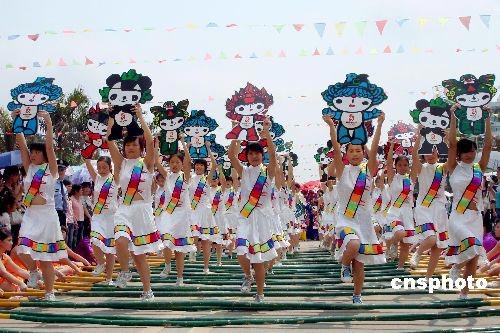 4月8日是中國最大的少數(shù)民族——壯族富有民族特色的傳統(tǒng)節(jié)日“三月三”歌圩。“中國壯鄉(xiāng)”廣西武鳴縣2008名壯族男女身著各色鮮艷的民族服裝,排著整齊的表演方陣,在近千米長的竹杠陣內(nèi),跳起民族傳統(tǒng)的竹杠舞歡慶節(jié)日,喜迎奧運會。中新社發(fā) 黃艷梅 攝