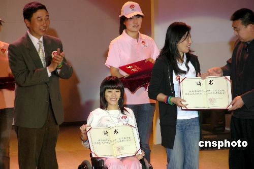 四月十日,中國首枚冬奧會金牌獲得者揚揚、前體操運動員桑蘭和中國相聲名家馮鞏被聘為北京奧運會、殘奧會文明觀眾、拉拉隊隊長。圖右為楊揚從北京奧組委志愿者部部長劉劍手中接過聘書。作者: 沈嘉