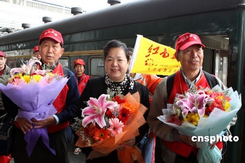 4月10日,2008年首列紅色旅游專列從廣東梅州市抵達(dá)天津,1000多名由退休老人組成的旅行團(tuán)將走訪天津及北京主要紅色旅游景點(diǎn),同時(shí)標(biāo)志著“紀(jì)念三大戰(zhàn)役勝利60周年系列主題活動(dòng)”正式啟動(dòng)。中新社發(fā) 趙雋 攝