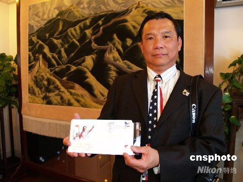 4月13日,美國郵政局發(fā)行“2008年北京奧運圣火傳遞舊金山首日封”。這枚首日封由華人設計師魏進發(fā)設計。中新社發(fā) 盧威 攝