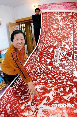 4月14日,由沈陽市民王玉芬創(chuàng)作的《百龍迎奧運》巨幅剪紙作品亮相沈陽,這幅剪紙作品長11米,高1.2米,由王玉芬耗時兩年時間創(chuàng)作完成,整幅作品由100條形態(tài)各異的龍與奧運標識組成,表達龍的子孫遙祝北京奧運會的成功舉辦。 中新社發(fā) 羅瀾 攝