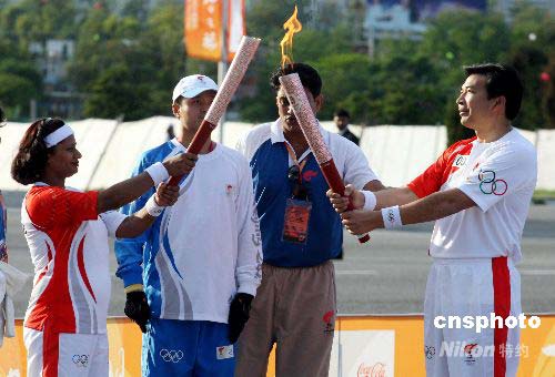 4月16日下午5時,巴基斯坦曲棍球隊前隊長義夫拉·汗從巴基斯坦總統(tǒng)穆沙拉夫和總理吉拉尼兩人手中接過第一棒“祥云”火炬,北京奧運(yùn)圣火開始在巴基斯坦首都伊斯蘭堡傳遞。圖為中國駐巴基斯坦大使羅照輝(右)與第三棒火炬手交接。作者: 沈晨