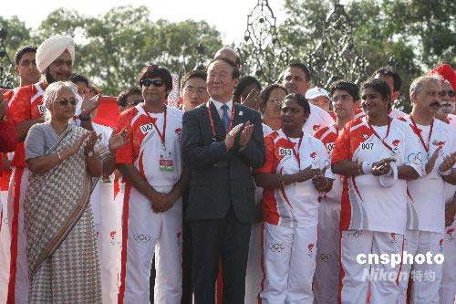 4月17日下午,北京奧運(yùn)圣火傳遞活動在新德里印度總統(tǒng)府和印度門之間的拉吉大街上進(jìn)行。70名火炬手沿著這條三公里長的大街傳遞圣火。圖為北京奧組委執(zhí)行副主席蔣效愚出席北京奧運(yùn)圣火新德里傳遞起跑儀式。作者: 沈晨
