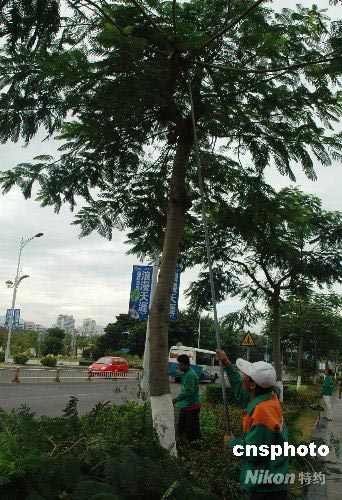 4月18日,海南三亞的園林工人在街道上修剪樹(shù)枝備戰(zhàn)臺(tái)風(fēng)“浣熊”。中新社發(fā) 尹海明 攝