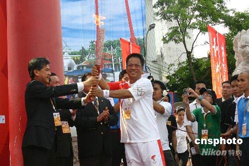4月19日下午3時15分,祖籍中國海南的泰國第二代華裔阿南·詩里帕差臘蓬從曼谷市市長阿皮拉手中接過“祥云”火炬,北京奧運圣火在此間的傳遞正式開始。北京奧運圣火在曼谷的傳遞約10.8公里,共有80名火炬手,其中泰籍華人占一半以上;鹁孀蕴迫私种腥A門出發(fā)后,途經(jīng)臥佛寺、大王宮、民主紀念碑、集拉達王宮、阿南達王宮等曼谷著名景點后,最終在五世王銅像廣場舉行慶典儀式。圖為阿南·詩里帕差臘蓬(右)從曼谷市市長阿皮拉手中接過“祥云”火炬。 中新社發(fā) 沈晨 攝