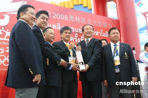 圖為曼谷市市長(zhǎng)阿皮拉(左四)與北京奧組委執(zhí)行副主席蔣效愚(左五)共舉圣火燈。 沈晨 攝