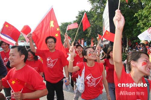 圖為中國(guó)留學(xué)生高舉國(guó)旗經(jīng)過(guò)曼谷市民族紀(jì)念碑時(shí)高呼:“北京奧運(yùn)一定成功!中國(guó)加油!。 顧時(shí)宏 攝