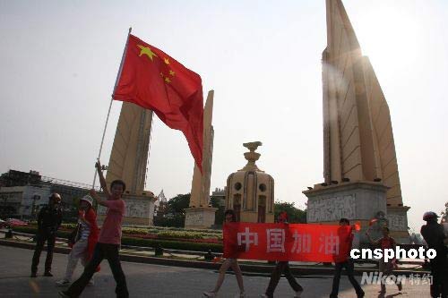 曼谷市中心的民族紀念碑被前來給火炬?zhèn)鬟f助威的中國留學生、華人華僑與當地市民圍得水泄不通,人人都以一睹奧運圣火為快。圖為留學生高舉國旗經過曼谷民族紀念碑。 顧時宏 攝