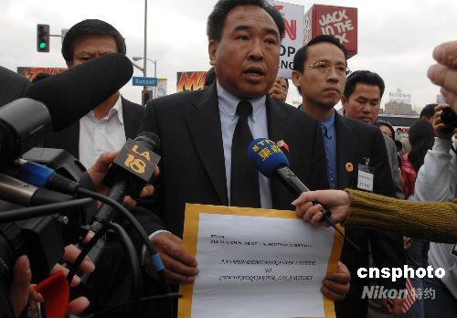 當?shù)貢r間4月19日上午,示威活動現(xiàn)場總指揮陳軍(中)準備向CNN遞交抗議信,但最終CNN方面無人出面接受抗議書。洛杉磯當天爆發(fā)十幾年來最大規(guī)模的華人華僑抗議示威活動。數(shù)千名華人華僑和留學生在CNN洛杉磯分部門前參加和平示威,要求CNN向公開鄭重道歉,并開除卡弗蒂。中新社發(fā) 張煒 攝