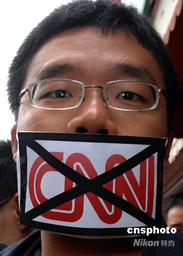 當?shù)貢r間4月19日上午,洛杉磯當天爆發(fā)十幾年來最大規(guī)模的華人華僑抗議示威活動。數(shù)千名華人華僑和留學生在CNN洛杉磯分部門前參加和平示威,要求CNN向公開鄭重道歉,并開除卡弗蒂。圖為一名抗議者戴著抗議CNN的口罩參加示威活動。中新社發(fā) 張煒 攝