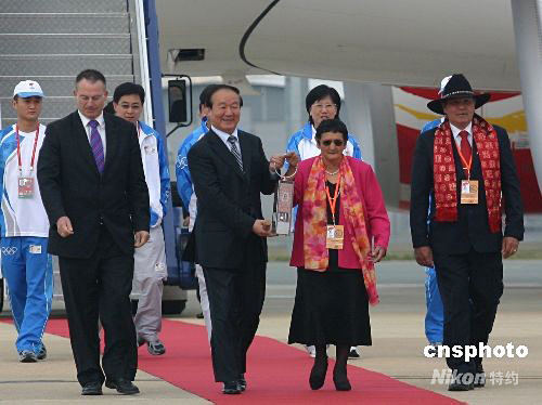 圖為北京奧組委執(zhí)行副主席蔣效愚(左二)與澳大利亞原住民大酋長(zhǎng)艾格尼斯夫人(右二)在機(jī)場(chǎng)共舉奧運(yùn)圣火燈。 作者: 沈晨