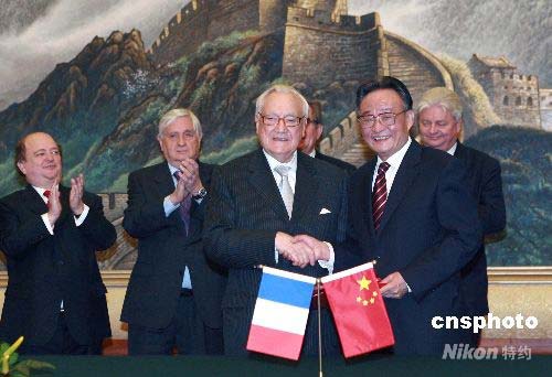 4月25日,全國人大常委會委員長吳邦國在北京人民大會堂與法國參議院議長蓬斯萊舉行會談。會后雙方簽署了中華人民共和國全國人民代表大會與法蘭西共和國參議院建立定期交流機制的協(xié)議。中新社發(fā) 廖文靜 攝