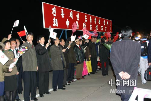 4月28日凌晨0時20分,載有北京奧運圣火的“奧運圣火號”平穩(wěn)地降落在平壤國際機場。朝鮮首都平壤是北京奧運圣火海外傳遞“和諧之旅”的第18站。這是奧運圣火自一九三六年開始傳遞活動以來,首次來到朝鮮。圖為中國華人華僑在平壤歡迎奧運圣火到來。沈晨 攝