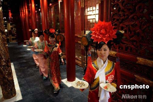 穿著“格格”服裝的服務(wù)員為北京老舍茶館新增設(shè)的小滿漢全席上菜,該席最高消費3000元每人。中新社發(fā) 廖攀 攝
