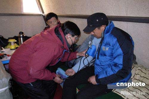 自4月28日,受邀采訪2008北京奧運會火炬接力珠峰展示活動的中外媒體入住珠峰大本營絨布新聞中心后,新聞中心住房、通訊、食宿和醫(yī)療等設(shè)施齊備且環(huán)保,為中外記者提供采訪保障。這里能找到世界上海拔最高的郵政代辦所,居住的活動房、電力設(shè)施、網(wǎng)絡(luò)等所使用的均是環(huán)保材料,符合珠峰自然保護區(qū)的各項環(huán)保規(guī)定。圖為新聞中心的醫(yī)生在為有高原反應(yīng)的記者作身體檢查。 中新社發(fā) 盛佳鵬 攝