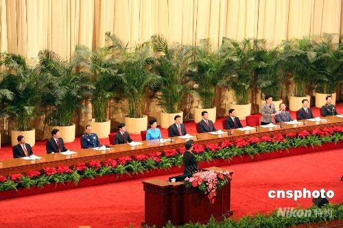 四月三十日,北京奧運會倒計時100天誓師大會在人民大會堂舉行。全國政協(xié)主席賈慶林等領(lǐng)導出席。中新社發(fā) 任海霞 攝