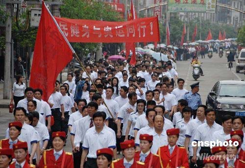 4月30日,南康市民參加健步行。當(dāng)天是北京奧運(yùn)會倒計時100天,江西南康市舉行了“慶五一,迎奧運(yùn),樹新風(fēng),促和諧”職工萬人健步行活動,慶!拔逡弧眹H勞動節(jié),迎接北京奧運(yùn)會。 中新社發(fā) 許朝陽 攝