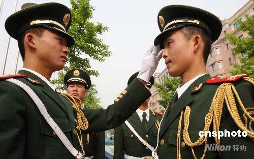 4月30日,北京飯店舉行迎奧運倒計時100天千人簽字活動,北京飯店被國際奧委會正式確立為第29屆奧林匹克大家庭總部飯店,隨著2008北京奧運會的臨近,飯店開展了以奧運為目標的服務技能比賽,投入到奧運接待服務工作中。北京飯店千名員工,以及天安門國旗護衛(wèi)隊、中國人民解放軍軍樂團參加奧運倒計時100天儀式。 圖為在北京飯店奧運倒計時100天儀式上天安門國旗護衛(wèi)隊戰(zhàn)士整理軍容。 中新社發(fā) 錢興強 攝