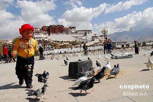 小童與鴿子嬉戲在布達(dá)拉宮廣場。中新社發(fā) 張權(quán) 攝