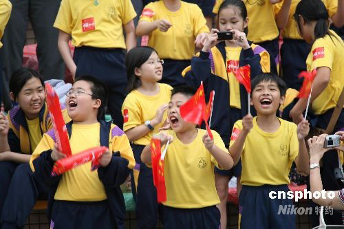 圖為在沙田馬場出席“萬眾歡騰迎圣火”大型社區(qū)慶;顒(dòng)的小朋友們。中新社發(fā) 武仲林 攝