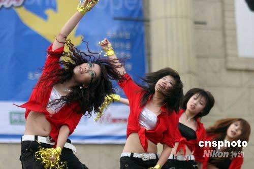 2008年“五一”期間, 2008“中網(wǎng)·網(wǎng)動中國”網(wǎng)球拉拉隊團體復(fù)賽在北京歡樂谷舉行。來自北京十幾所高校的拉拉隊選手參加了比賽,進入前三名的選手將取得2008中國網(wǎng)球公開賽拉拉隊的資格。中新社發(fā) 陳曉根 攝