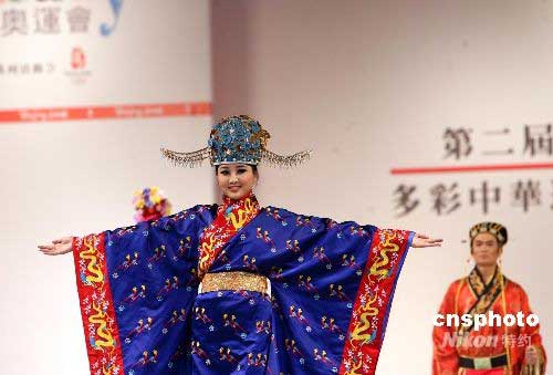 五月三日,香港各界青少年迎奧運系列活動委員會在香港會展中心舉辦“多彩中華迎奧運 人文奧運大匯演”。圖為模特在先進燈光效果襯托下,展示珍貴歷史服飾。中新社發(fā) 洪少葵 攝