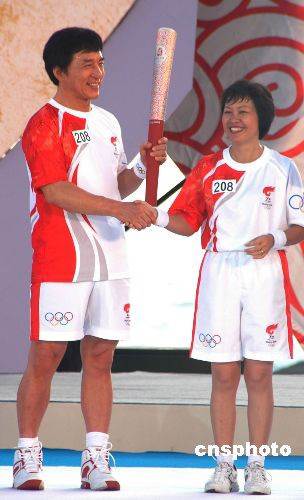 北京奧運會火炬接力三亞傳遞于五月四日晚六時左右圓滿結束, 最后一棒火炬手著名影星成龍和三亞天涯鎮(zhèn)女鎮(zhèn)長蒲慧芳在該段傳遞終點天涯海角點燃圣火盆。 中新社發(fā) 王辛莉 攝